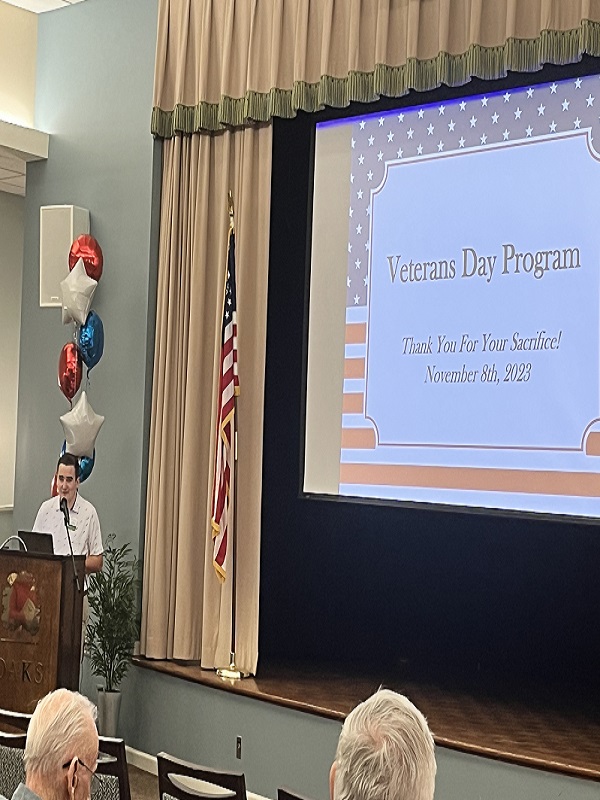 This event drew over 50 attendees, several embellished in military flair including hats, jackets, medals, and badges. Veterans were asked to stand for distinction when their military branch was called during the playing of the “Armed Forces Medley” – this included the U.S. Army, U.S. Navy, U.S. Airforce, U.S. Coast Guard, and U.S. Marine Corps. Each resident veteran was then recognized by name before the crowd joined in a beautiful rendition of “God Bless America.” A community Veterans Day tribute was also on display throughout the week.