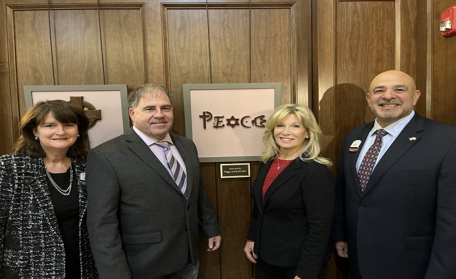 Several pieces on display within the Interfaith Center are in honor of major gift donors, including a beautiful “peace” plaque contributed by the late Margaret “Peggy” Mary Fahy, a former resident of The Oaks. Members of the Fahy family attended the grand opening in Peggy’s memory.